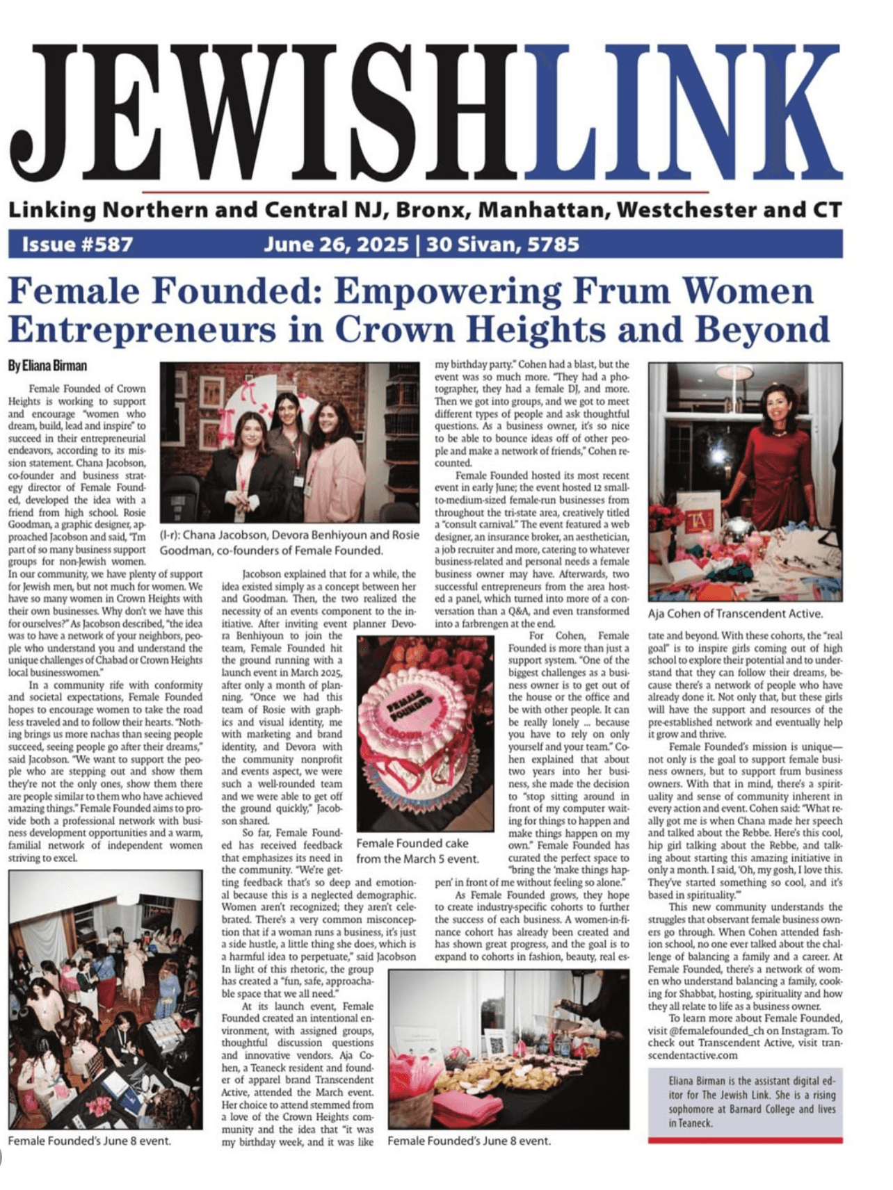 Less than a year in, Female-Founded was featured on the front page of the publication, The Jewish Link.